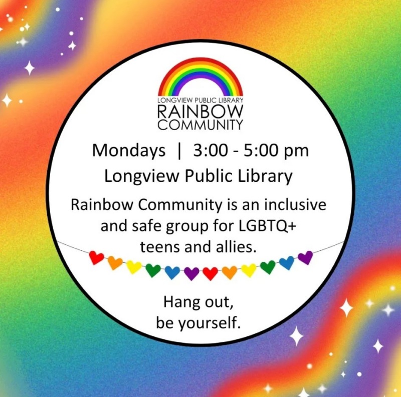 Rainbow Community is an inclusive and safe group for LGBTQ+ teens and allies. Hang out and be yourself! Join us Mondays at 3 pm (holidays excluded), in the Library Auditorium. Call 360-442-5323 for more information. No meeting when the Library is closed: September 1 and October 13, 2025.